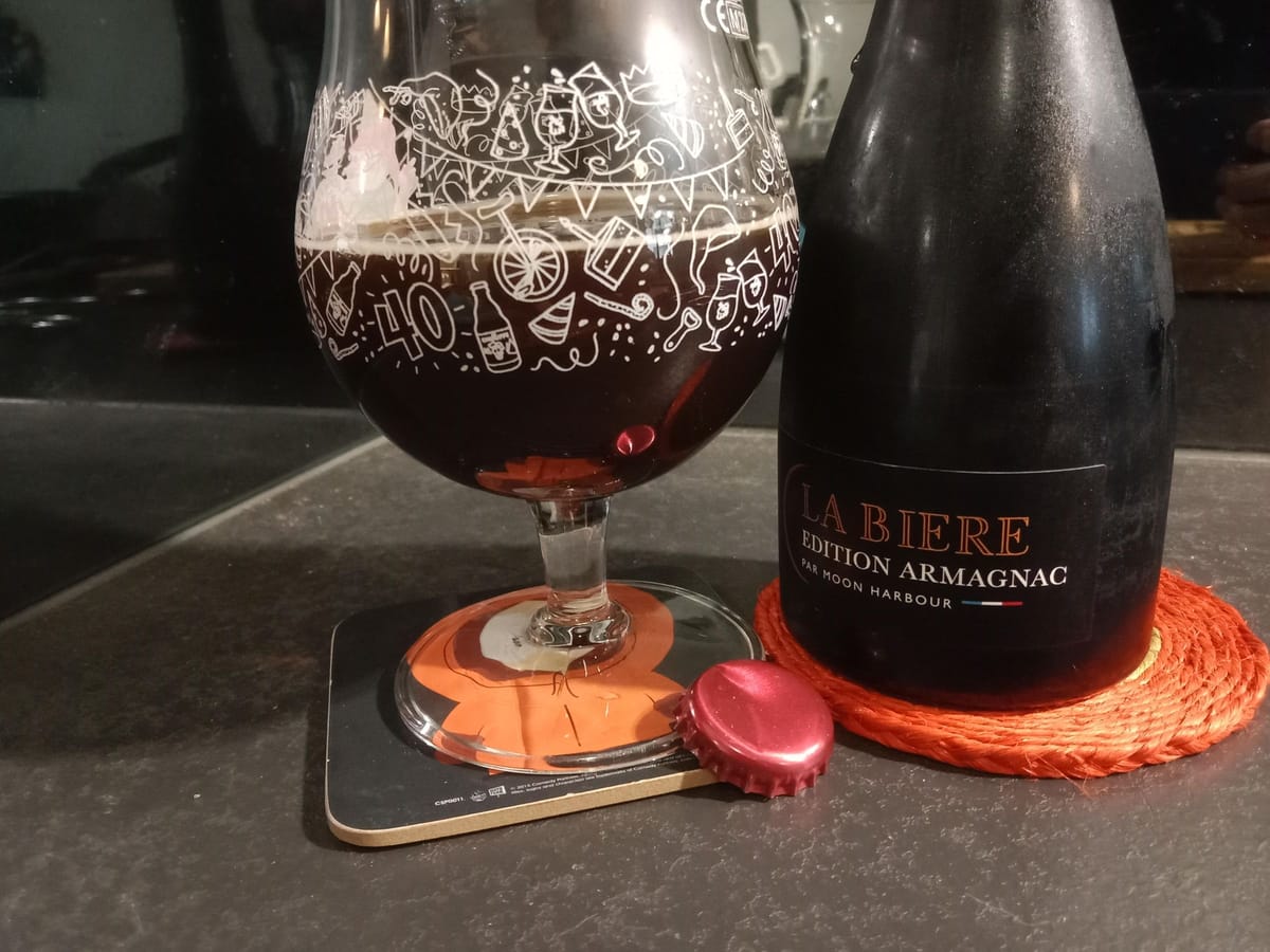 Robe noire opaque avec des reflets marrons, mousse moyenne marron foncée. J'm'attendais à un robe plus "épaisse" et sirupeuse pour un stout à 11° 🤔 Nez pruneau, raisin sec, chaud, alcooleux, pointe chocolatée mais chocolat à la liqueur 😅 Étonnement plutôt fluide en bouche. L'alcool se fait vite sentir, c'est chaud, réconfortant & assez amer. Vient ensuite un arôme fruité (fruit noir pruneau raisin sec) et un côté "sec" qui doit être l'arôme de l'Armagnac (je ne pense pas en avoir déjà bu dans ma vie... ça me fait penser à du whisky 🤔) Peu de longueur en bouche ce qui la rend assez traître (une fois le pic "chaud" passé on ne se sent plus l'alcool). La fin de bouche est sur le côté pruneau amer et alcoolisé... Bien moins sur l'amertume chocolatée d'une stout "normale" 😉 Une bonne bière d'hiver que j'attendais un poil plus ronde. Très agréablement surpris, j'ai plus apprécié que celle au rhum 👍 Très bonne avec du pâté ou un fondant de porc aux pleurotes 👌
